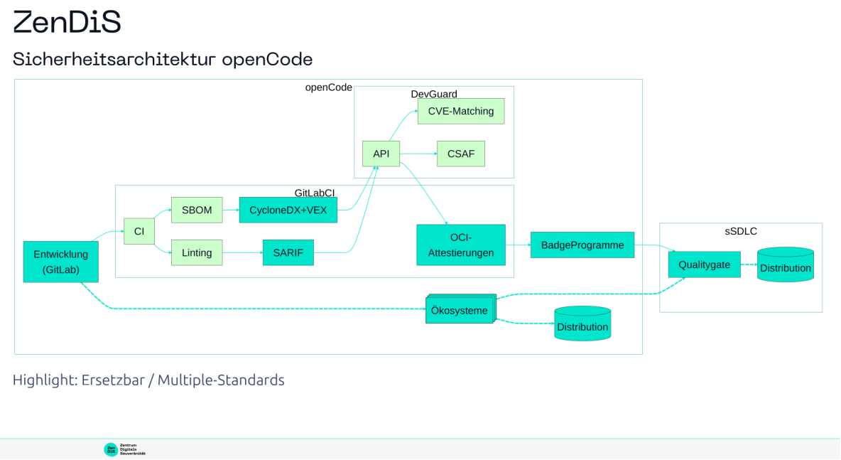 Über ein reines Code-Repository hinaus bietet openCode viele Funktionen für ein gesundes Ökosystem. Der Code wird von automatisierten Tools analysiert. Dabei wird eine SBOM (Software Bill of Materials) erstellt, die angibt, welche Bibliotheken und andere Software als Grundlage für ein Projekt dienen. Außerdem wird der Code auf mögliche Probleme untersucht (“linting”). Über die Software DevGard werden diese Informationen mit CVEs (Beschreibungen sicherheitskritischer Fehler) zusammengeführt. Aus all diesen Daten kann dann automatisiert eine grobe Aussagen darüber getroffen werden, wie gut eine Software gewartet ist oder wie schnell auf Sicherheitsprobleme reagiert wird. Das wird dann “plakativ” in sogenannten Bades dargestellt. Ziel ist es (potentiellen) Nutzenden Entscheidungshilfen zu geben, welche Software sie nutzen sollen.