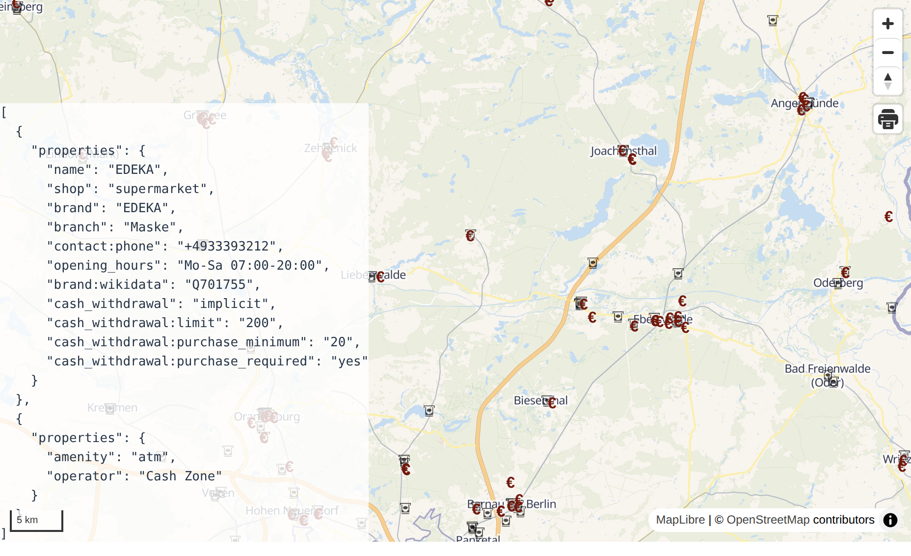 Dazu wurden mittels osm2pgsql zwei Postgis-Tabellen mit Geldautomaten und Geschäften, bei denen Bargeldauszahlungen vom Bankkonto möglich sind, angelegt. Für die Geldautomaten werden die OSM-Tags amenity=atm und atm ausgewertet. Für die Geschäfte wird der Key cash_withdrawal ausgewertet; außerdem wird über die Keys brand und operator festgestellt, ob das Geschäft zu einer Kette gehört, die Barabhebungen in ihren Filialen ermöglicht. Über eine Postgis-Abfrage werden Polygone herausgefiltert, die als Möglichkeit zum Bargeldabheben getaggt sind und zuzätzlich Geldautomaten oder entsprechende Geschäfte als Nodes enthalten. Das Ergebnis dieser Postgis-Abfragen wird als Mapbox-Vektotiles ausgeliefert und kann als Layer in andere Karten eingebunden werden. Auf diese Weise werden die Daten zu Bargeldabhebemöglichkeiten zusammen mit den Kacheln der Hingrundkarte in den Client geladen, so dass sich eine Abfrage über die Overpass-API erübrigt. Der Vorteil dieser Vorgehensweise ist, dass auch Informationen für große Gebiete angezeigt werden können. So lassen sich Geldautomaten und Geschäfte auch auf niedriegeren Zoomstufen darstellen (hier ein Beispiel für Zoomlevel 9 ). Ein nächster Schritt könnte z.B. sein, clientseitig durch Auswertung der Öffnungszeiten tageszeitabhängig zu filtern, so dass nur die Automaten und Geschäfte angezeigt werden, bei denen man zum Zeitpunkt des Aufrufs der Karte tatsächlich Geld abheben kann.