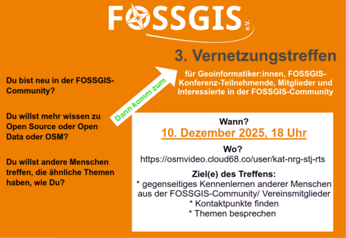 Vernetzungstreffen ür Geoinformatiker:innen, FOSSGIS-Konferenz-Teilnehmende, Mitglieder und Interessierte in der FOSSGIS-Community[Bearbeiten | Quelltext bearbeiten]