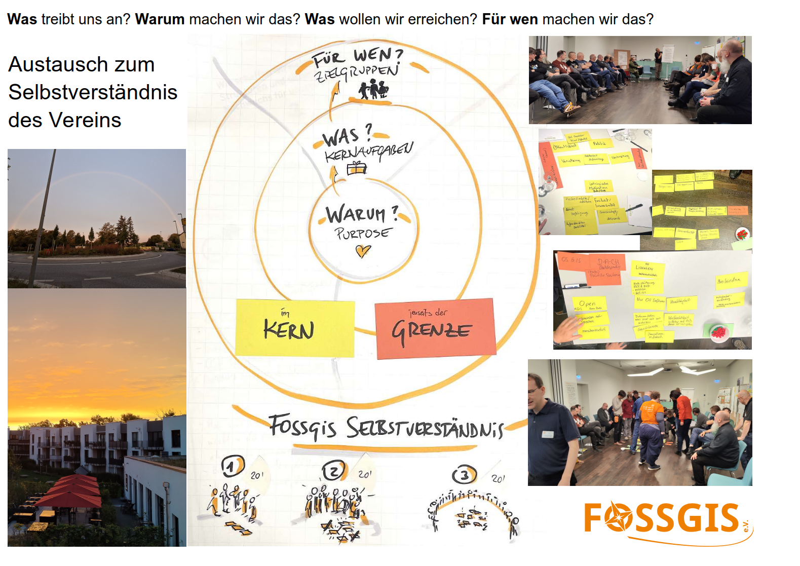 Katja Haferkorn eröffnete die Veranstaltung. Nach etwas Warmup in einer Art Speeddating-Gespräch und der Betrachtung des FOSSGIS als Bauwerk bildeten sich Arbeitsgruppen zu den vorbereiteten Entwicklungsfeldern (Mitglieder, nachhaltige Strkturen, Sichtbarkeit, Programmatik) und beschäftigen sich damit, wie es bisher läuft, wo es Probleme oder Druckpunkte gibt und was die Ursachen dafür sein könnten.