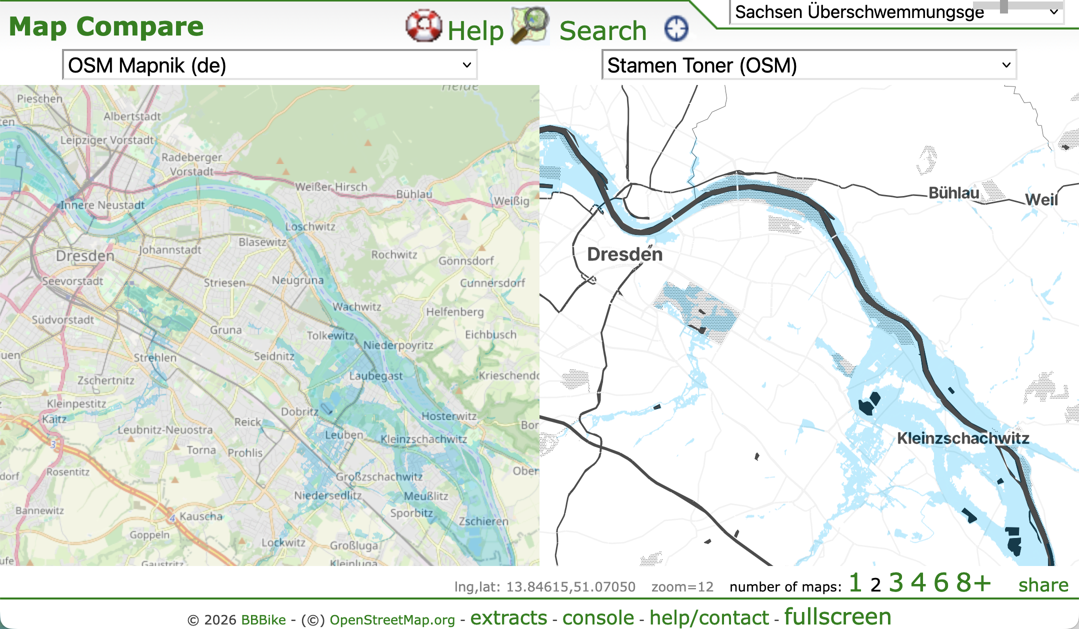 BBBike Map Compare ist ein spezialisiertes Kartentool, mit dem man verschiedene Online Karten direkt miteinander vergleichen kann.