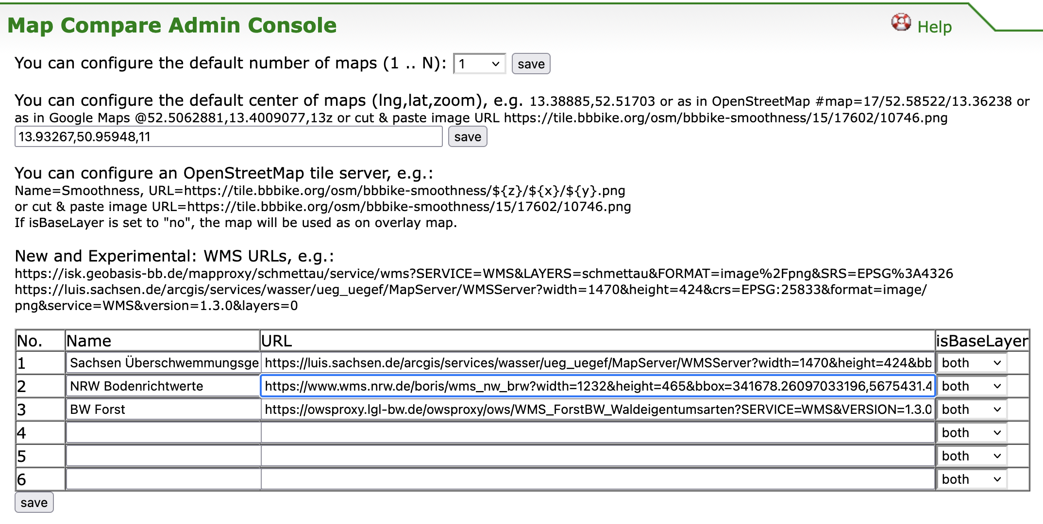 Neu ist auch die Einbindung externer WMS Services. In der Admin Console lassen sich zum Beispiel Karten aus Geoportalen einbinden und neben oder über eine OpenStreetMap Karte legen. Das funktioniert mit allen gängigen WMS Servern.