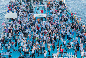 „Schon am Anleger hast Du so viele lächelnde, glückliche Menschen gesehen, dass du wirklich das Gefühl hattest: Die haben gerade eine tolle Zeit“, beschreibt Adams seine Eindrücke. Mit einem Lächeln begrüßt er jeden einzelnen der mehreren hundert Gäste. Dann geht die Fahrt los – bei schönstem Wetter auf dem Oberdeck, mit Live-Musik – vor allem die Queen-Coverband „The Queen Kings“ begeistert – und anschließender Party. So wundert es nicht, wenn am nächsten Morgen der Referent mit heiserer Stimme spricht, weil er zu viele Queen-Songs mitgesungen hat.