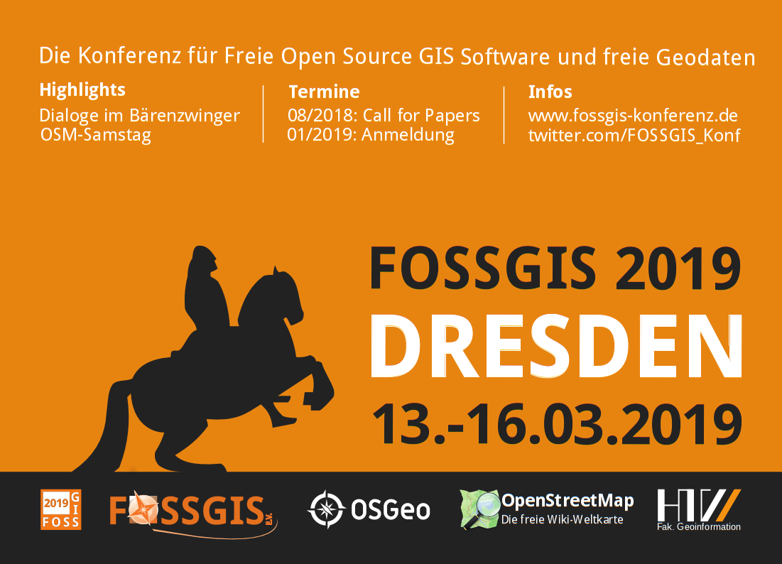 Vom 13. bis 16. März 2019 tagt die FOSSGIS-Konferenz 2019 in Dresden. Sie wird vom gemeinnützigen FOSSGIS e.V., der OpenStreetMap-Community und der Hochschule für Technik und Wirtschaft Dresden (HTW Dresden) veranstaltet.
