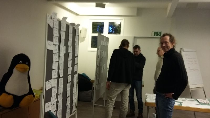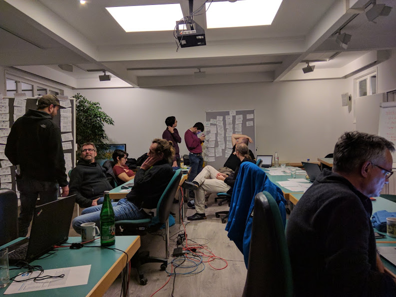 Dann ging es auch schon ans Werk. Großen Raum nahm diesmal die Vorbereitung der im März anstehenden FOSSGIS-Konferenz. Das Programmkommitee stellte das Konferenzprogramm zusammen. Die Vorträge und Workshops wurde gesichtet und über die vier Konferenztage verteilt. Auch der zeitgleich in Bonn stattfindende OSGeo Codesprint wurde geplant.