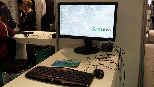 An mehreren Rechnern konnten die Besucher die aktuelle OSGeo-Live 11.0 ausprobieren und sich über 50 Softwareprojekte, Demodaten und Dokumentationen informieren. Manche Fragen konnten direkt über eine Demonstation an den Rechnern beantwortet werden.