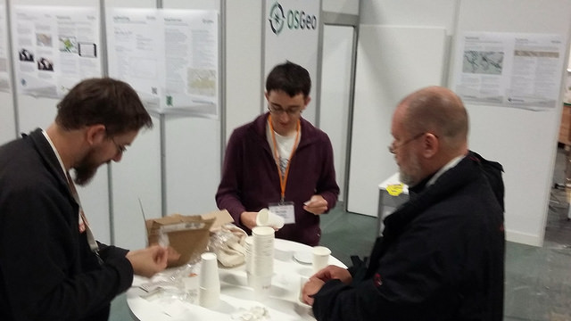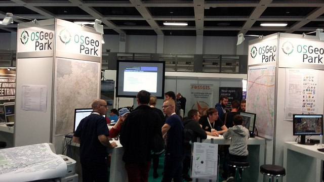 Während der drei Veranstaltungstage schauten zahlreiche Interessierte auf dem OSGeo Park vorbei. Die Besucher konnten sich dabei über Lösungen aus dem Open-Source-GIS Bereich und über OpenStreetMap informieren, Vorträge anhören, OSGeo-Live ausprobieren und ihre Lieblings-OSM-Karte drucken lassen.