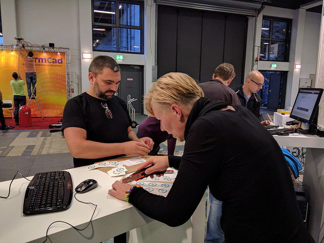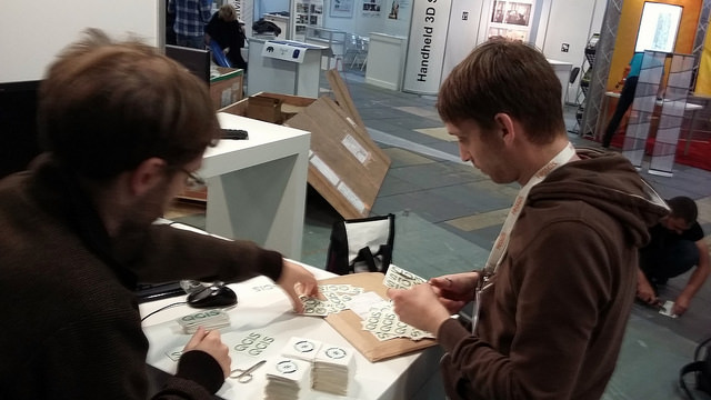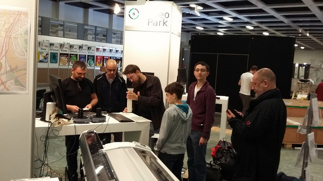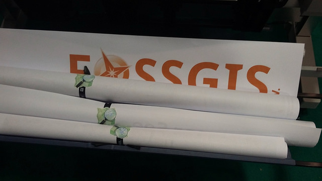 Es stand außerdem ein A0 Drucker bereit, über den die Besucher ihren bevorzugten OpenStreetMap Kartenausschnitt im Großformat ausdrucken und mit nach Hause nehmen konnten. Viele nutzten diese Möglichkeit, so dass nach 3 Tagen 150 Meter Papier bedruckt wurden.