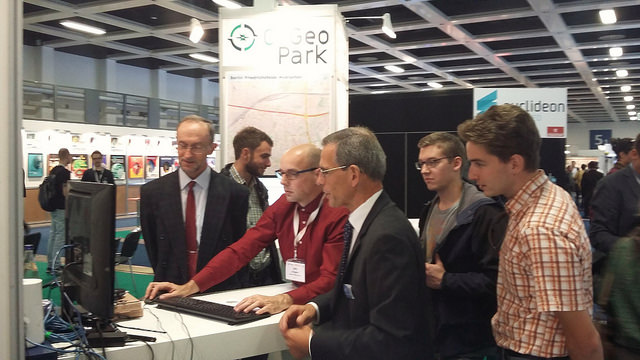 Gefreut haben wir uns über den Besuch von Staatssekretär Klaus Vitt, der bei seinem Rundgang über die INTERGEO an unserem Stand vorbeikam. Er interessierte sich für OpenStreetMap und wurde hierzu sehr kompetent von Michael Reichert (@Nakaner) beraten. Am Ende des Gesprächs betonte Herr Vitt, dass OpenStreetMap gefördert werden sollte.